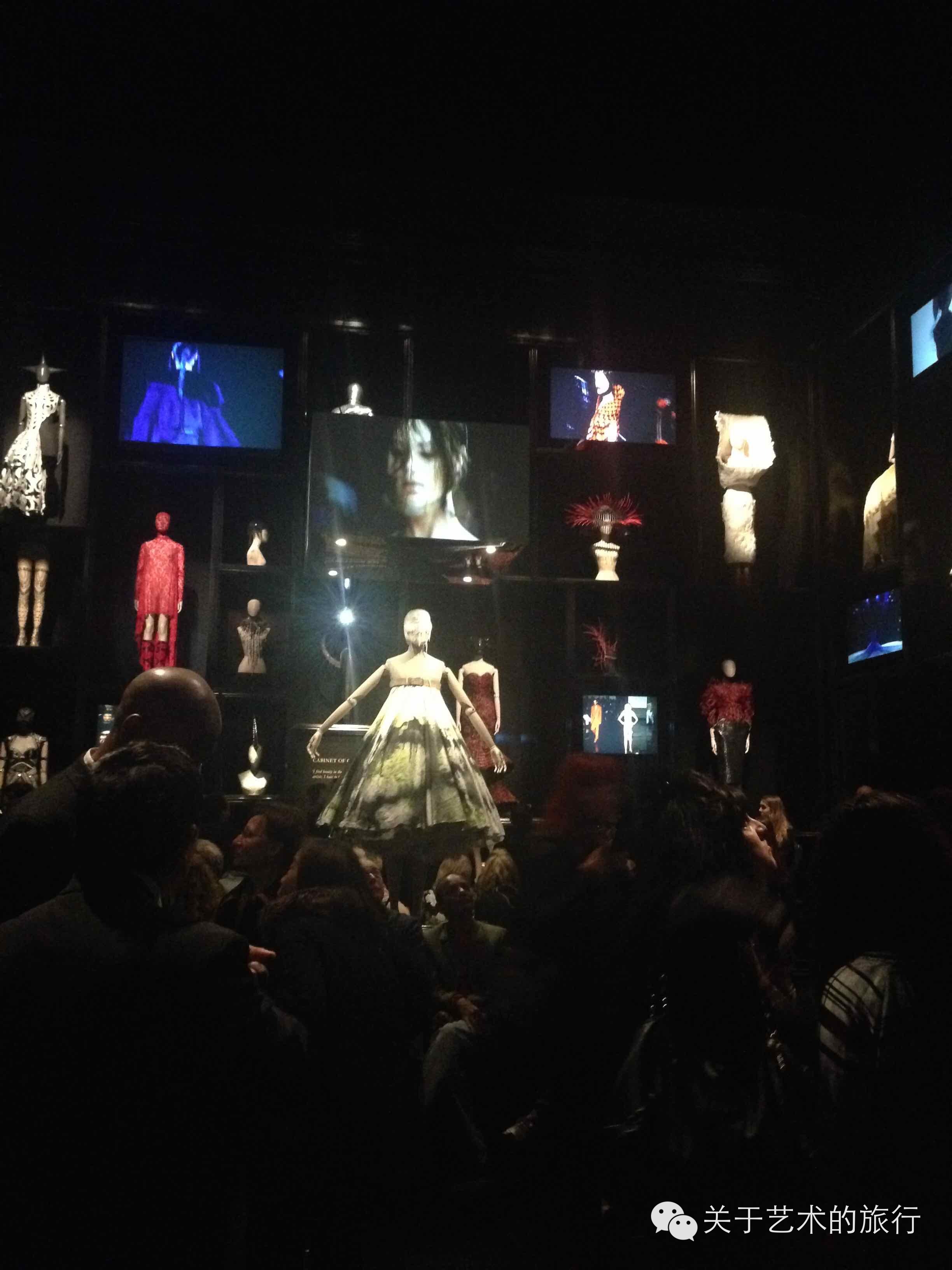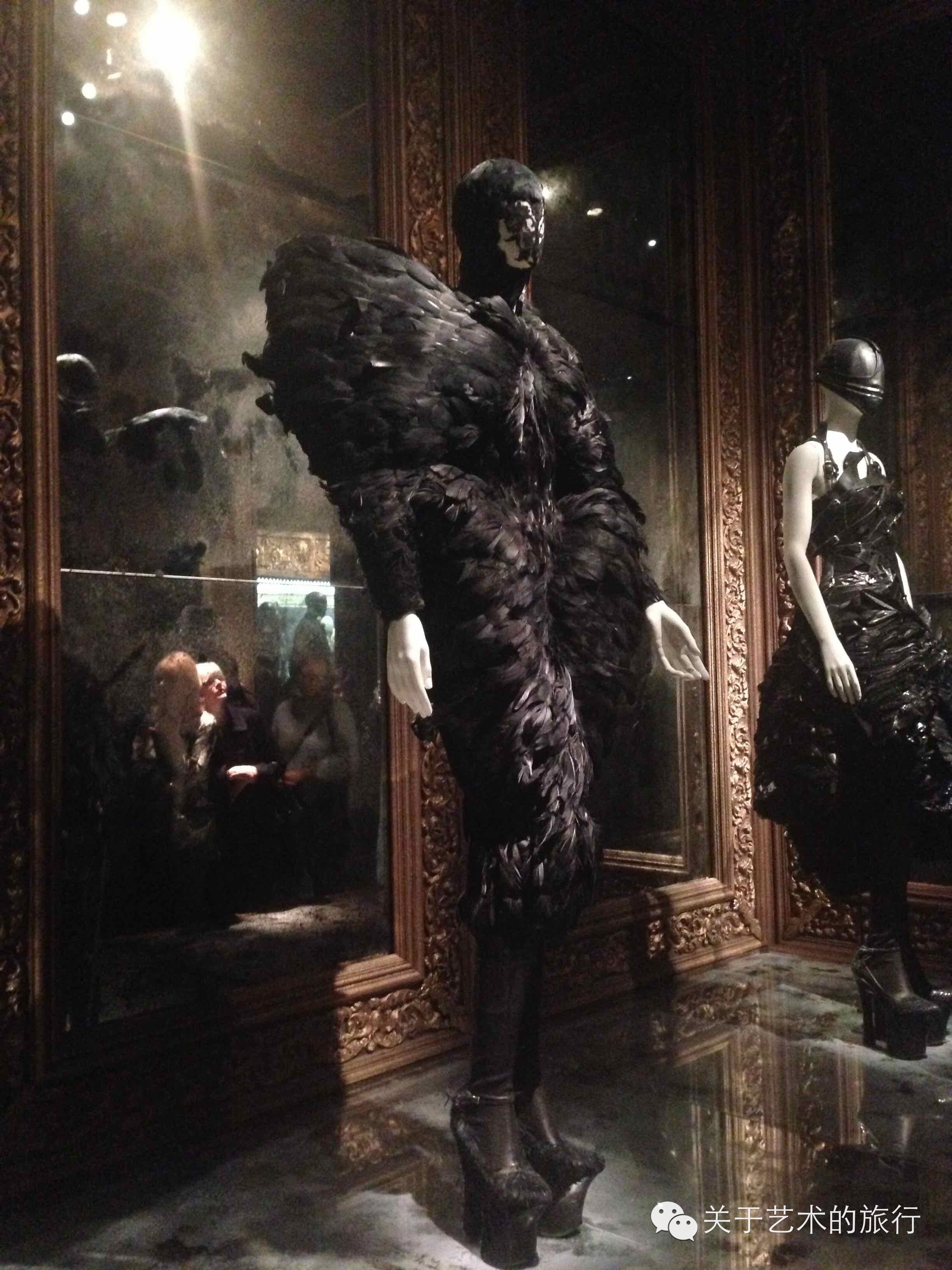 浪漫、脆弱、殘暴、情色、天真、優雅、放蕩、變態、荒蠻、華麗、虛榮、純情,讓人著迷的地方是他就可以把這些完全相反的東西妥妥的擰在一起,毫不衝突,而且所有的細節都展現得淋漓盡致。這裏有縱情的soho, 嬉皮的bricklane, 虛榮的紐約,熱血的蘇格蘭,還有各式的夢境。Romantic Gothic系列是古堡閣樓里舊情書般的集合神秘、性感、黑暗與浪漫, Romantic Primitivism的系列又夾雜了更多超現實的盡情暢想,而向自己蘇格蘭血統致敬的系列則透過傳統格子布與維多利亞時代宮廷華服的結合演繹高地的勇敢與熱烈。關於100個人和100個莎士比亞的老道理用cabinet of curiosities系列里在合適不過,看完展小憩的時候遇到 V&A陶瓷部分的專家老太太,她不僅不喜歡,甚至是為這個系列里痛苦的高跟鞋、面具、奇怪的面部裝飾而感到憤怒————這是一個自大的仇視女性的傢伙,天啊,我從這些設計里感到了惡意;而我,從轉進這個庭,看到高過4米的牆上如貨架般,立滿模特與如刑具般的冰冷金屬的各式裝飾,腦中哄然一響————性感!對,這個房間裡的設計就是你藏在身體深處不願為人所知的奇怪的慾望,岩洞般的閣樓里的模特讓我想到楚留香的蝙蝠傳奇里的蝙蝠島(好像是這個名字),小小一間的窯洞,每個房間里都有被刺瞎雙目的美麗女子,夜夜縱情。而McQueen自己的解讀是,和藝術家一樣,我總是能看到隱匿的不為人知的美。藥與春夢,恣意在這件房間。