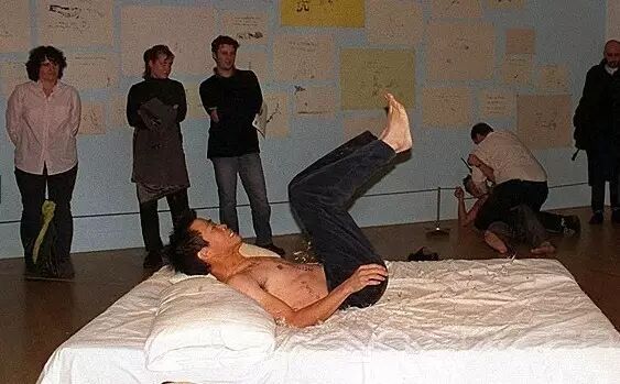 其实,早在1999年,马塞尔·杜尚(Marcel Duchamp)的经典作品《泉》在伦敦泰特美术馆展出期间,两位艺术家第一次合作也是他们的成名作《在杜尚小便池上撒尿》曾得到英国艺术界权威人士的认可;另外一件备受关注的作品是在崔西•艾敏(Tracey Emin)《我的床》现场跳床并相互厮斗,用强行介入的方式演绎了一场东西方文化的博弈,而崔西•艾敏的这件作品后被佳士得以220万英磅拍出。